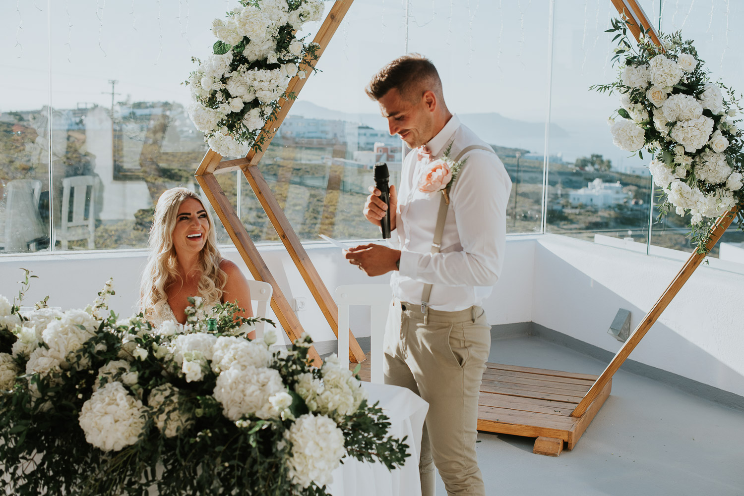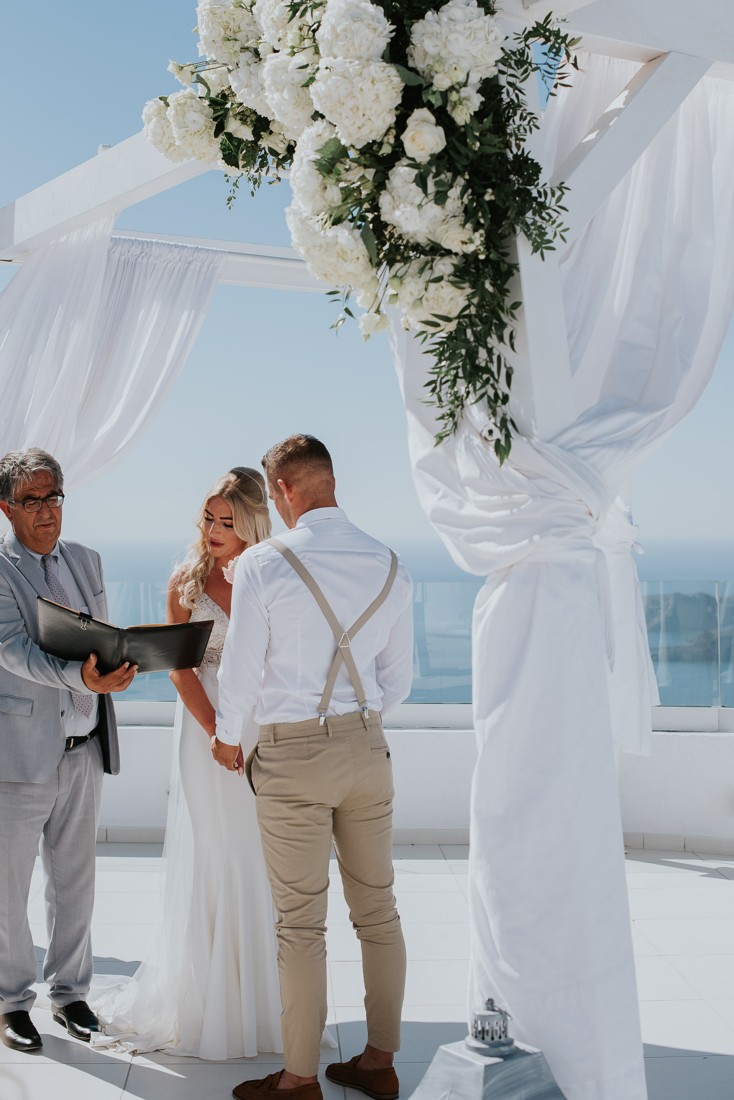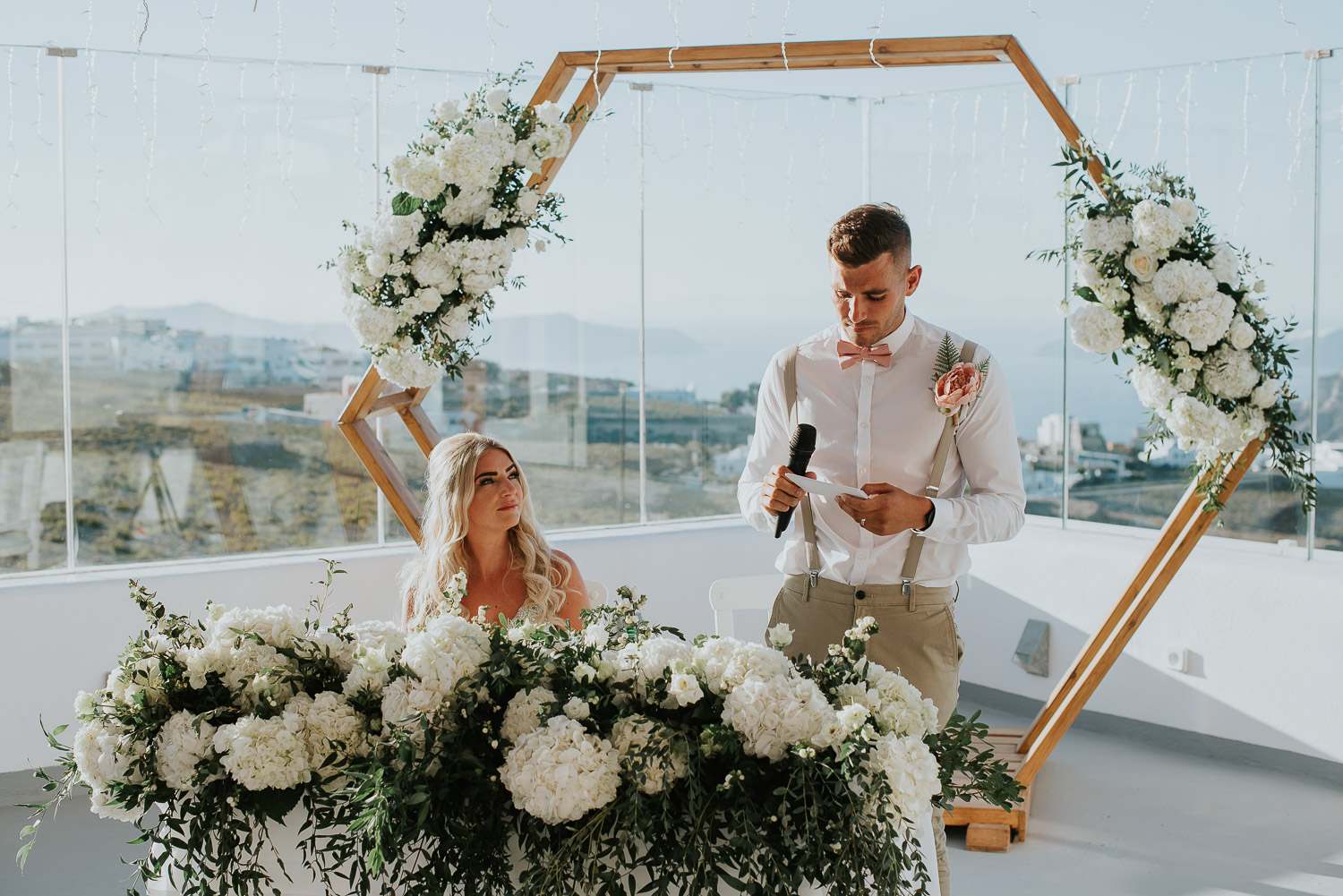 They chose Santo Wines and the truly breathtaking caldera backdrop for their wedding ceremony. The views stretch over the islands with Oia in the distance. The gazebo in the middle of the wedding terrace was adorned with white hydrengeas and roses beautifully arranged by Red box days.