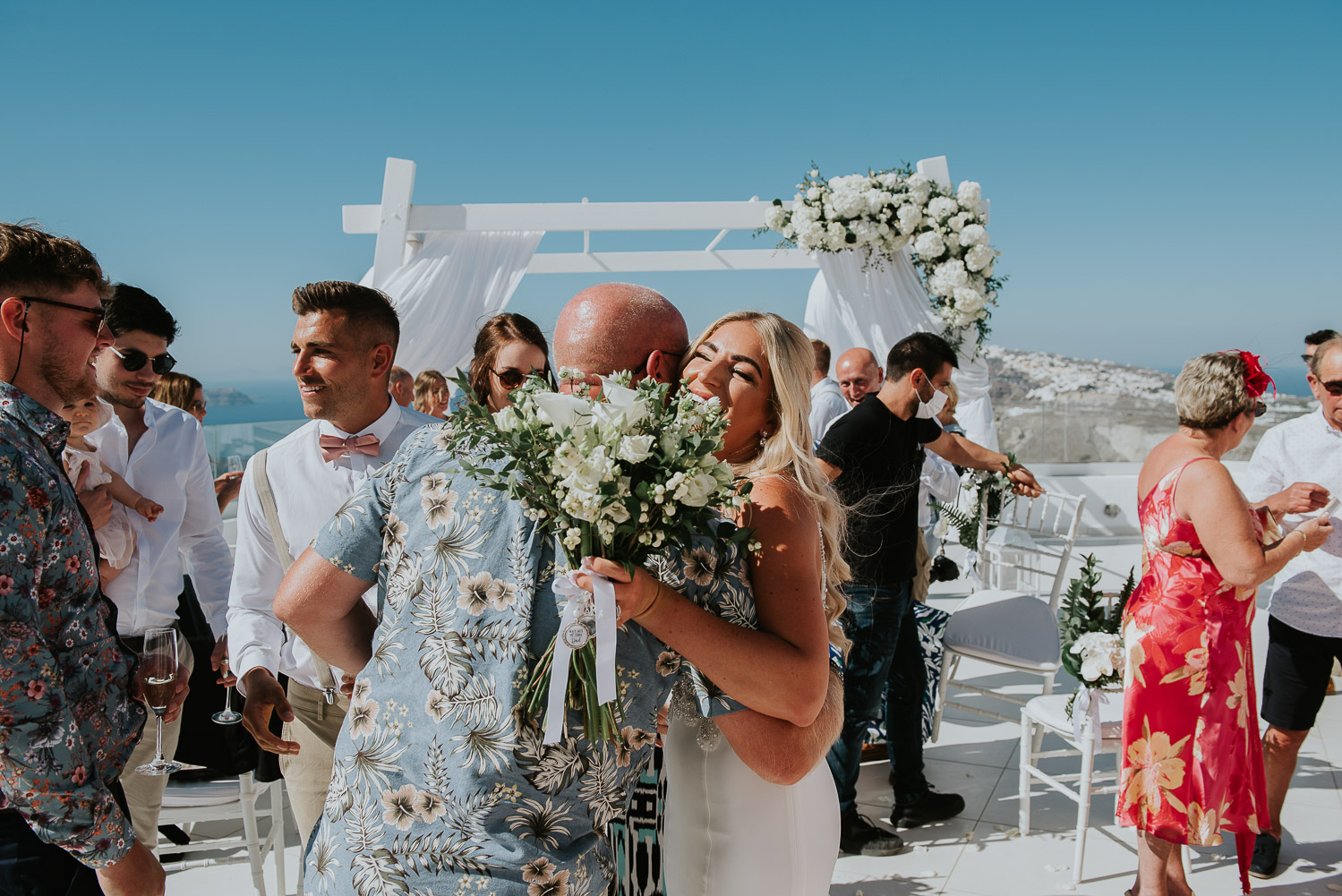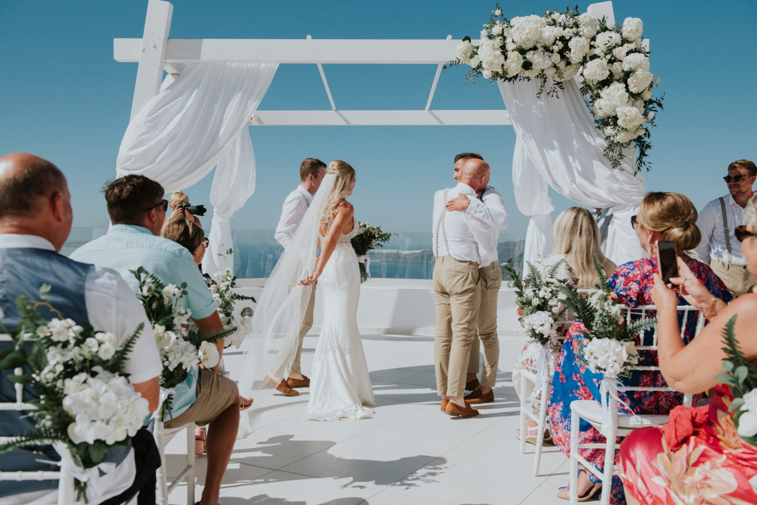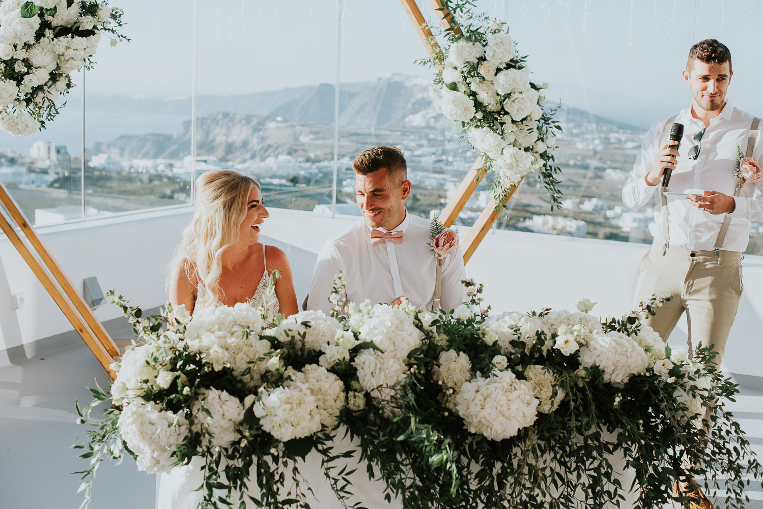 They chose Santo Wines and the truly breathtaking caldera backdrop for their wedding ceremony. The views stretch over the islands with Oia in the distance. The gazebo in the middle of the wedding terrace was adorned with white hydrengeas and roses beautifully arranged by Red box days.