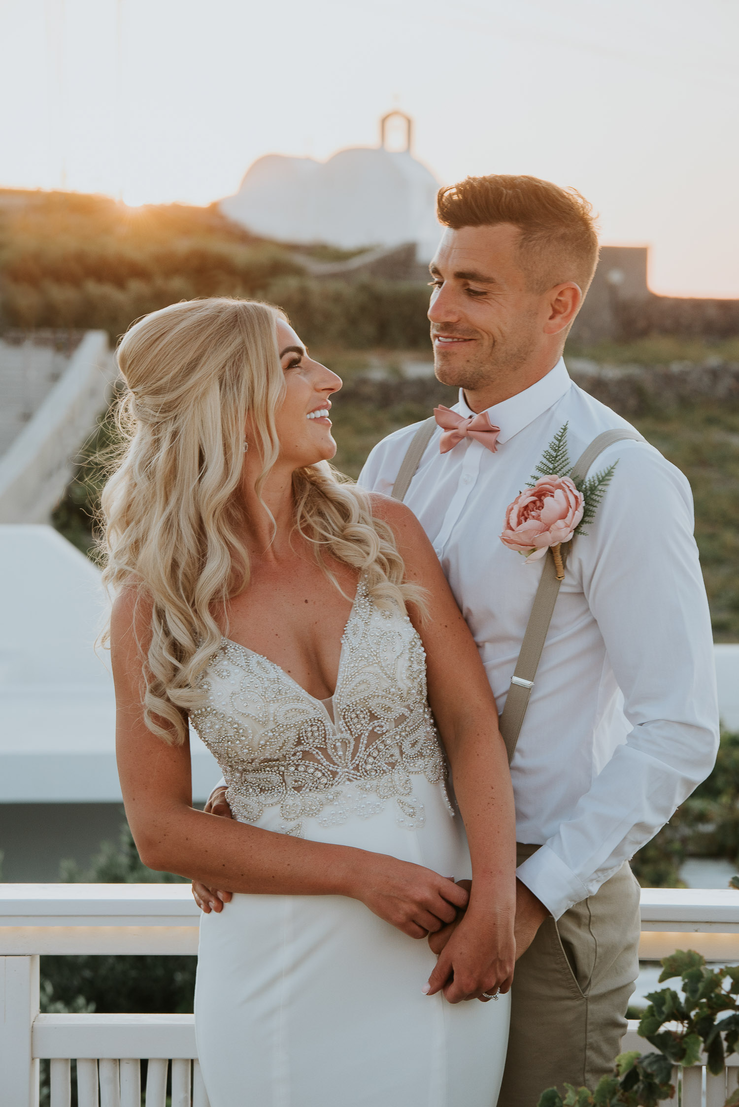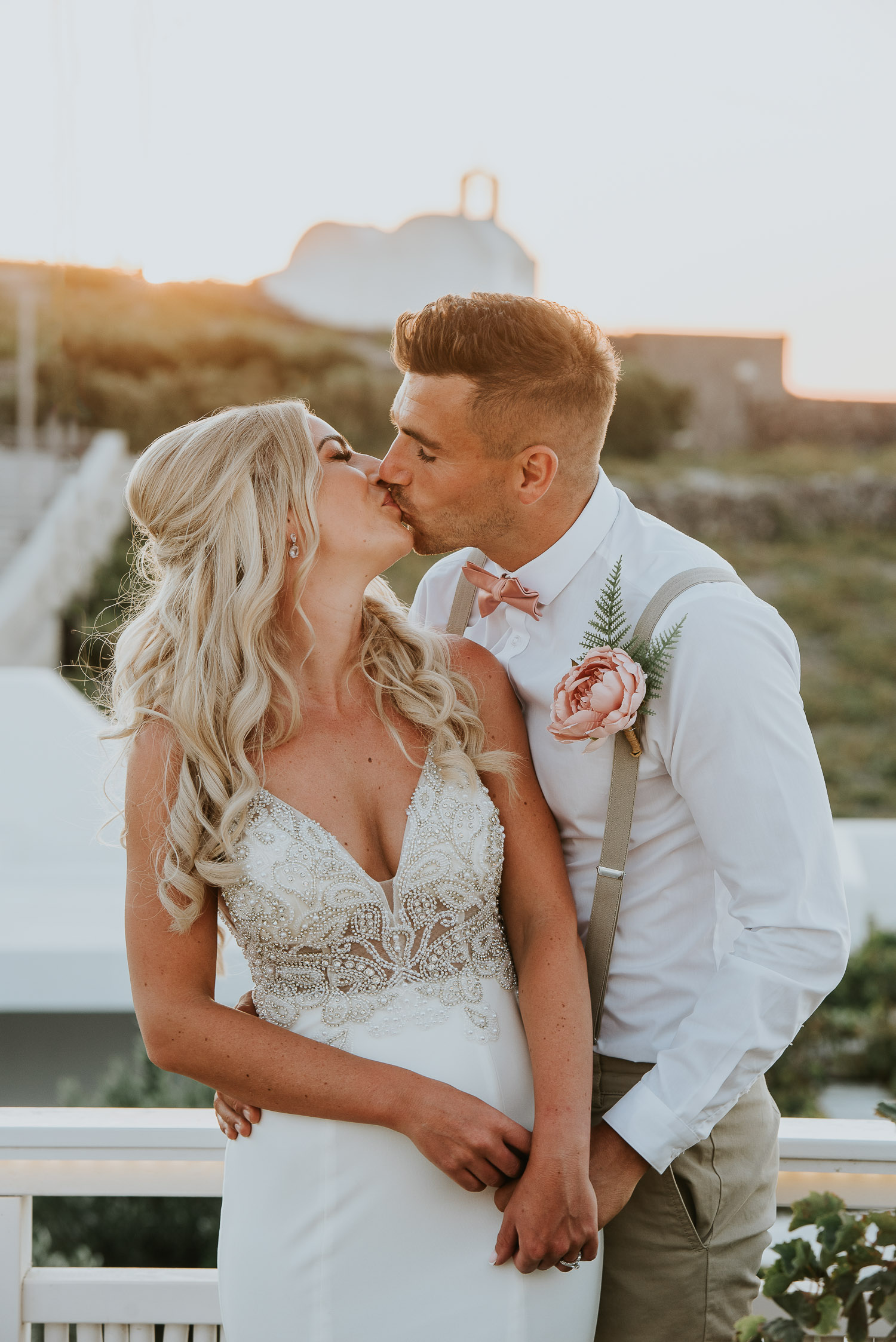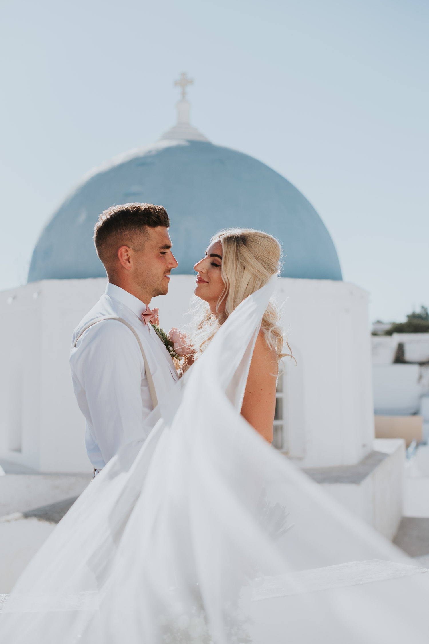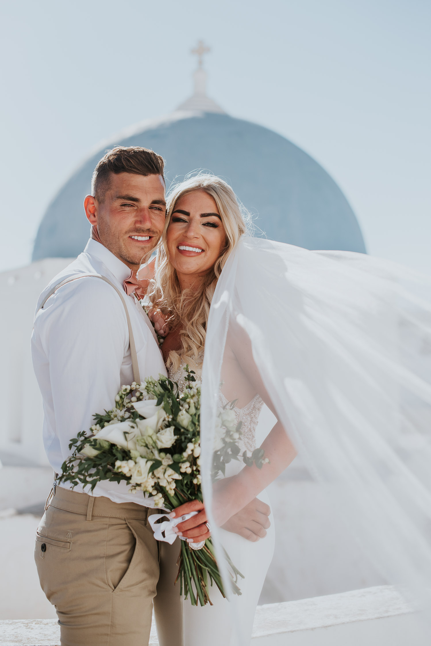Further down the road, we found ourselves at one of our favourite spots. It is absolutely breathtaking, any time of day. The bell towers give such a Greek feel to the photos and the blues of the Aegean sea complimented our newlyweds.