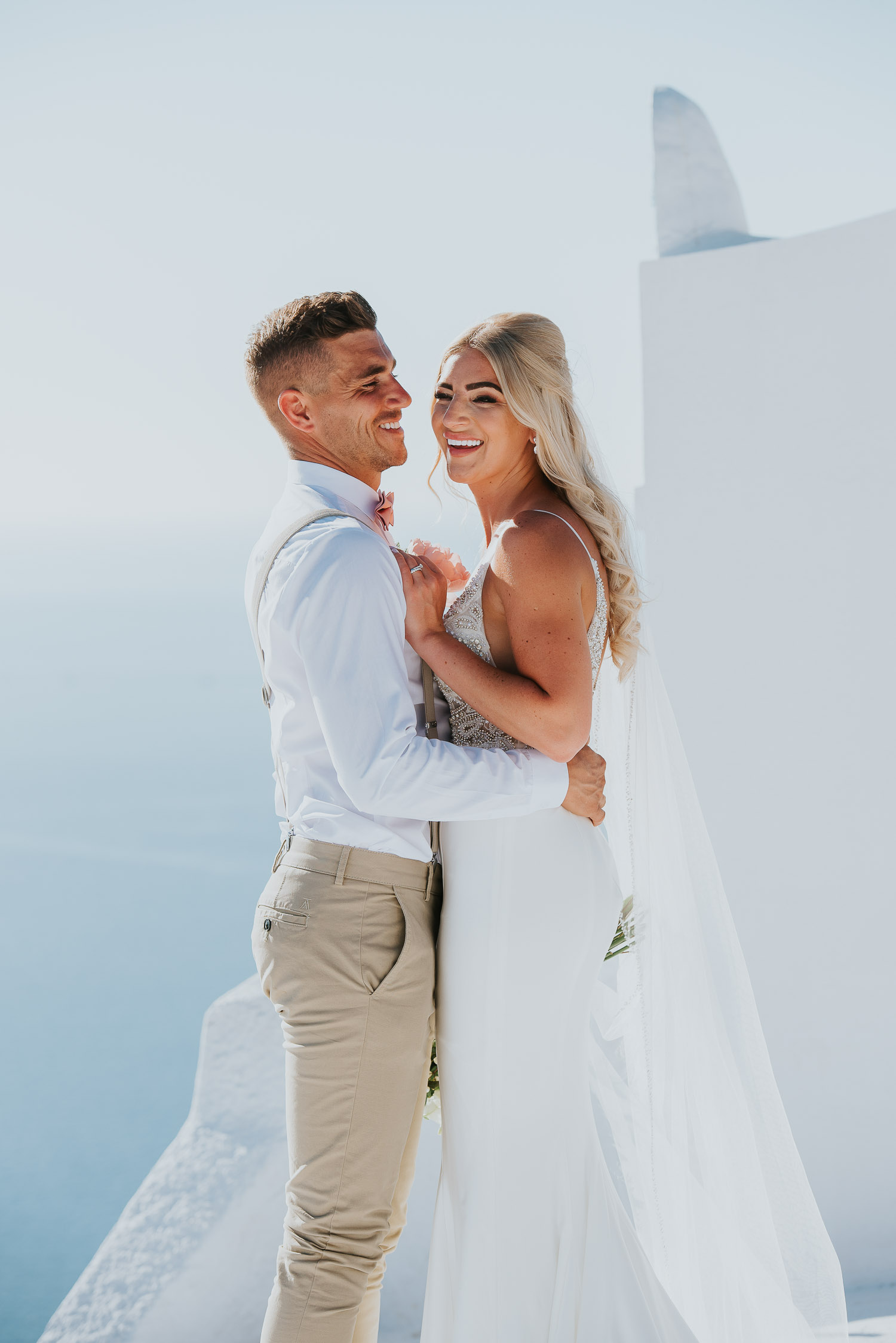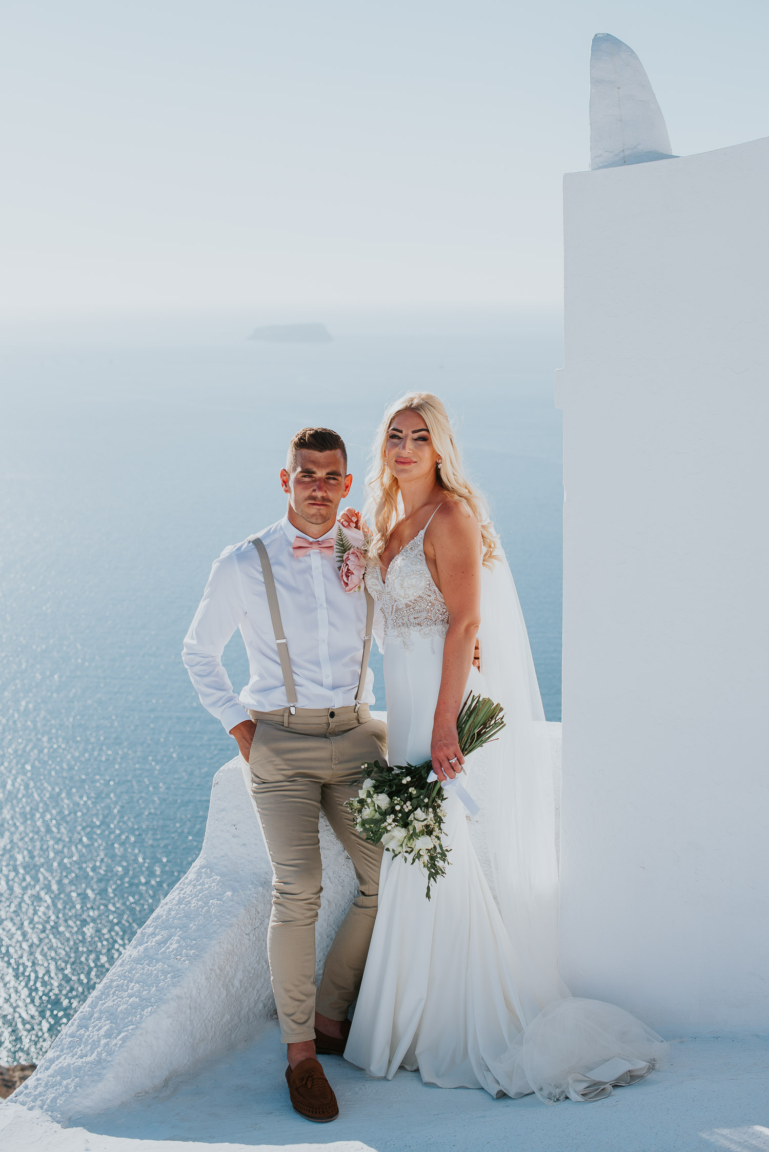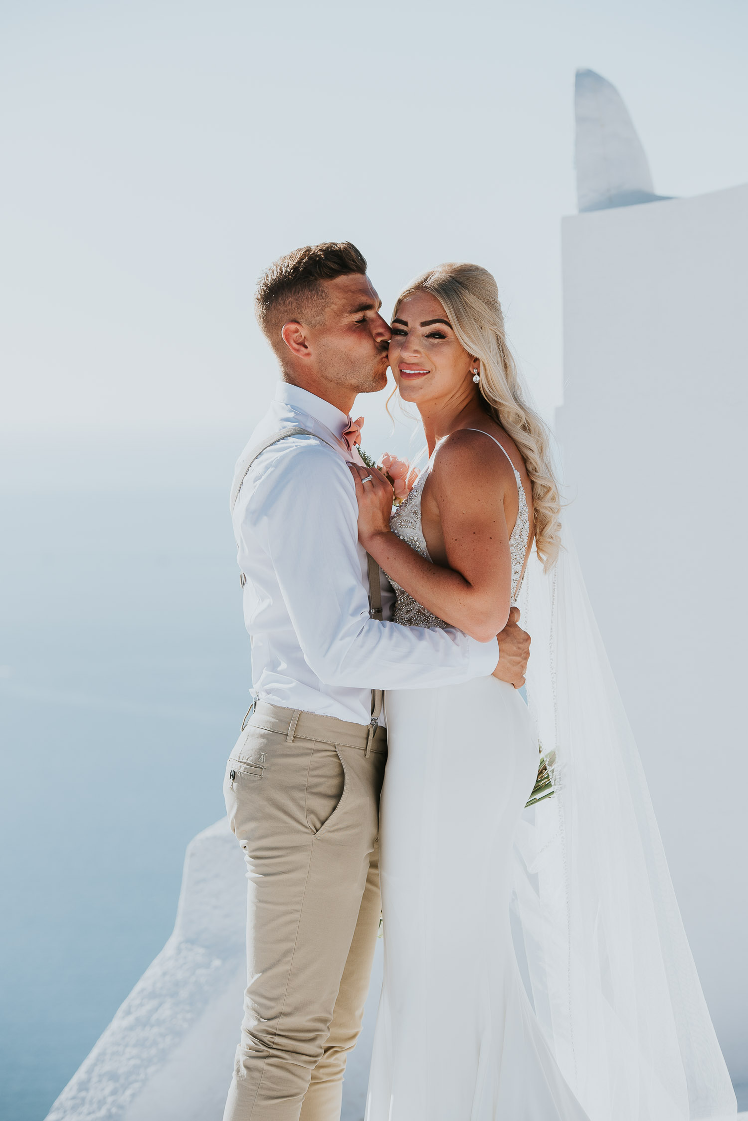 Further down the road, we found ourselves at one of our favourite spots. It is absolutely breathtaking, any time of day. The bell towers give such a Greek feel to the photos and the blues of the Aegean sea complimented our newlyweds.