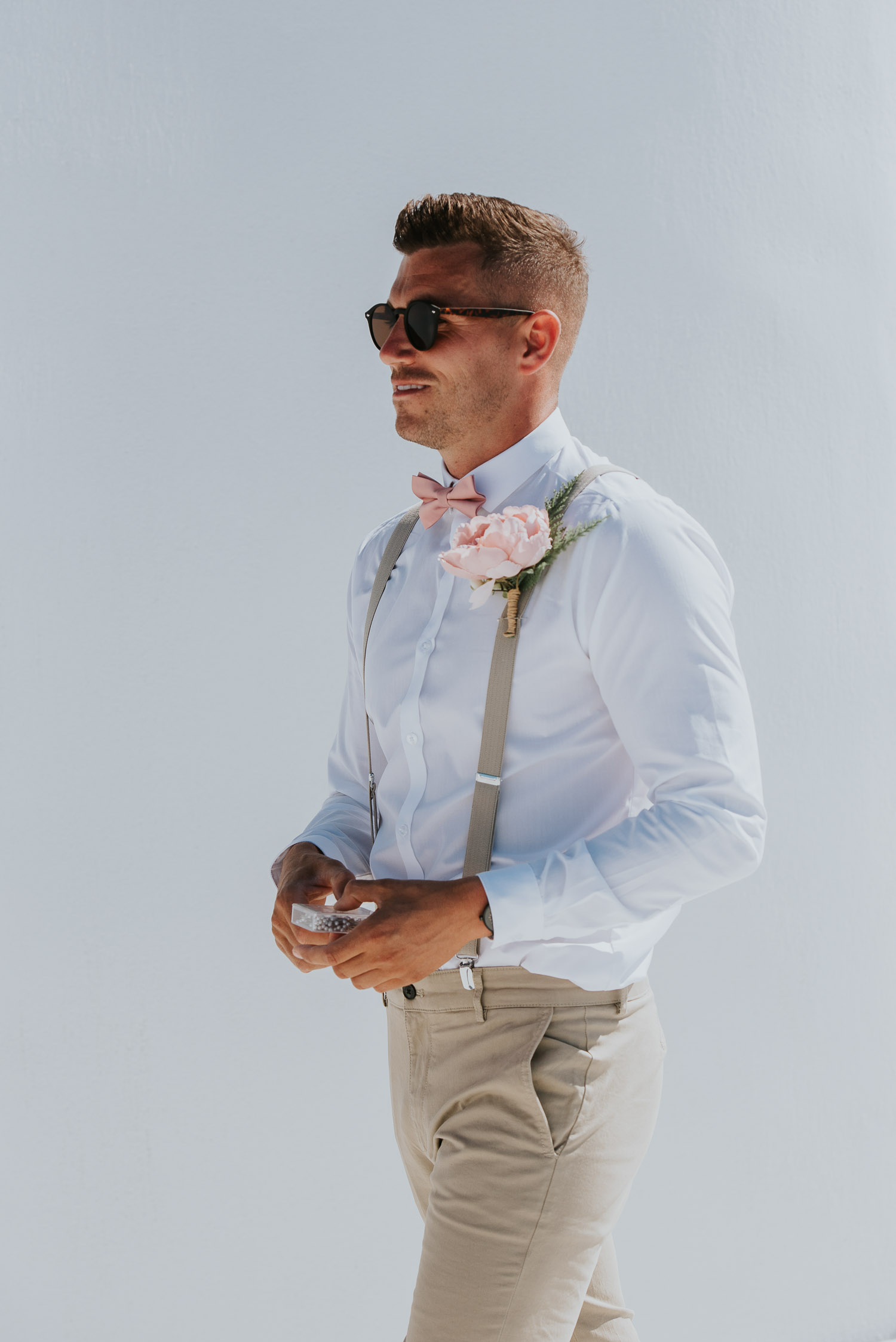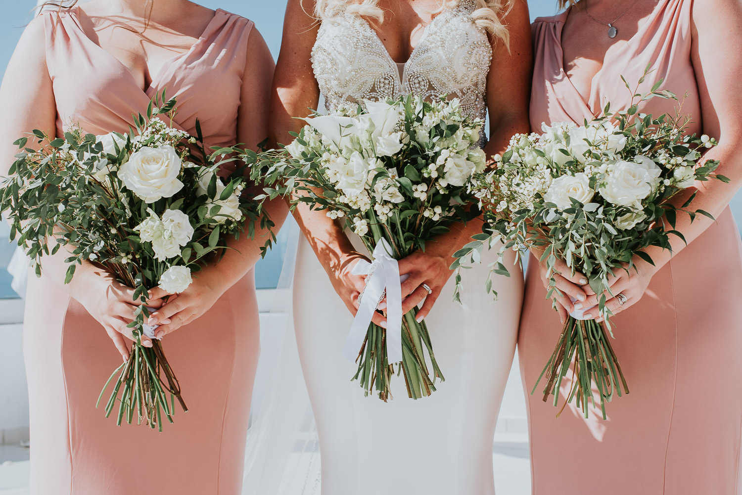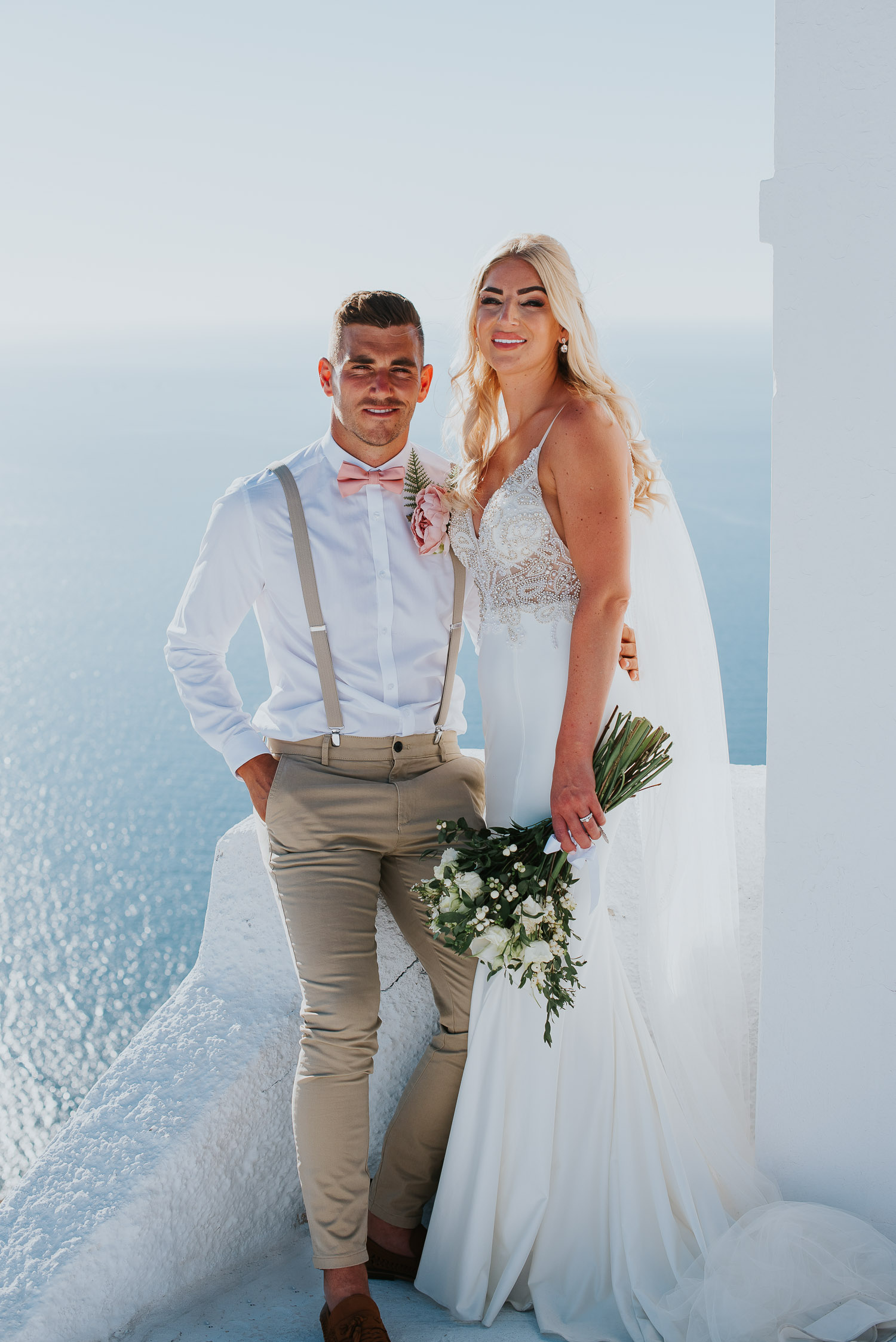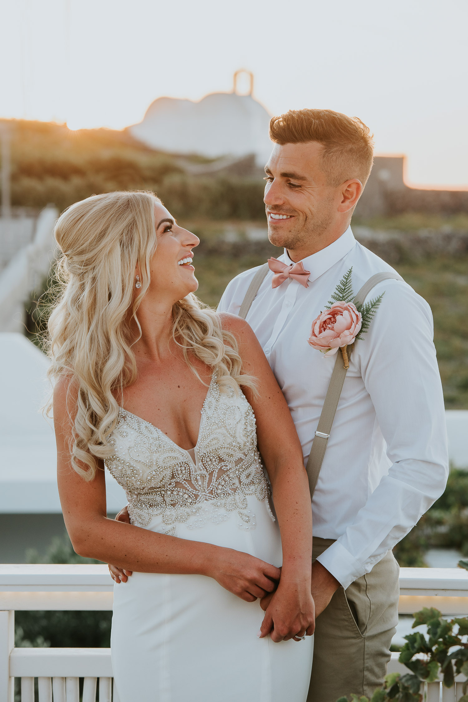 Further down the road, we found ourselves at one of our favourite spots. It is absolutely breathtaking, any time of day. The bell towers give such a Greek feel to the photos and the blues of the Aegean sea complimented our newlyweds.