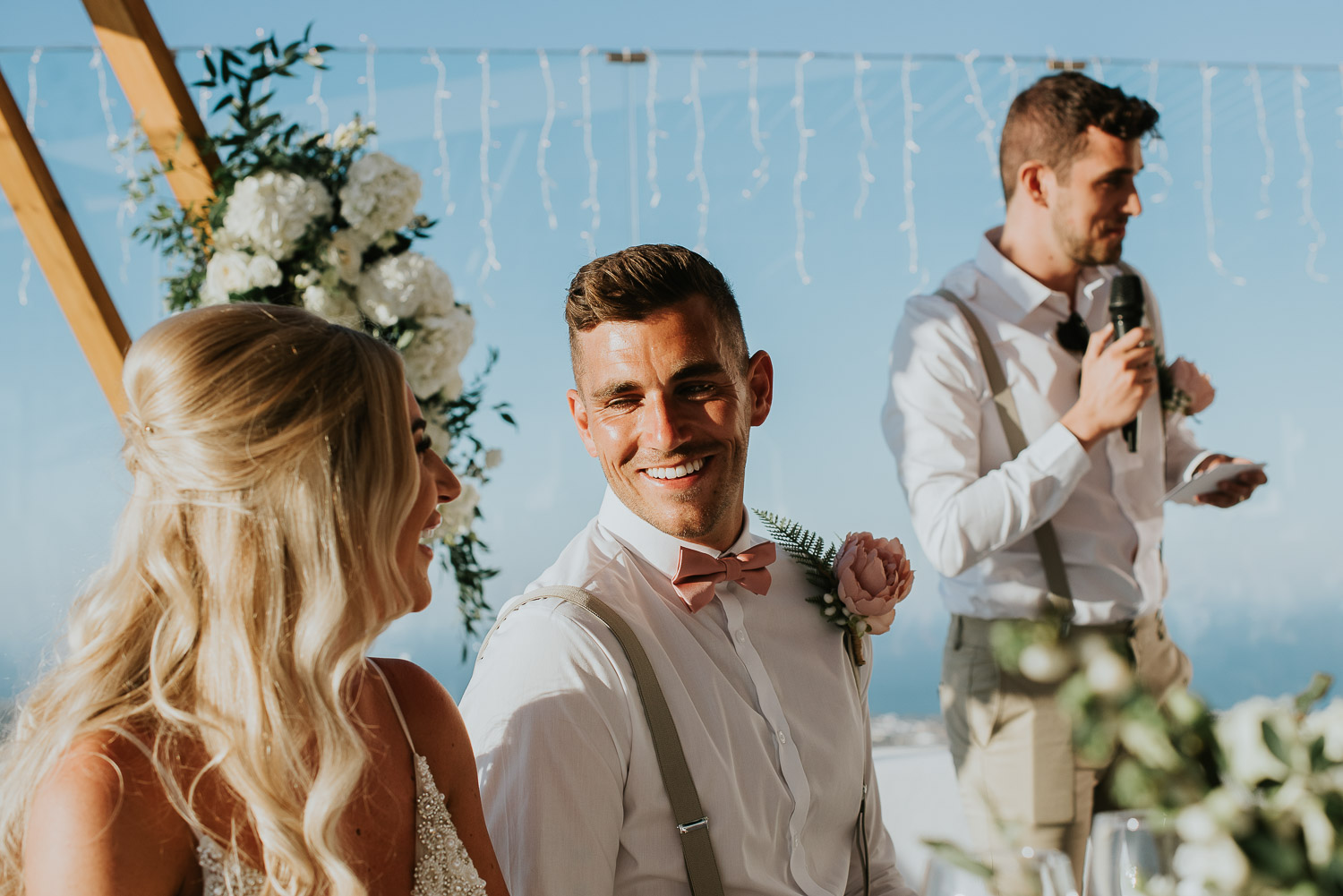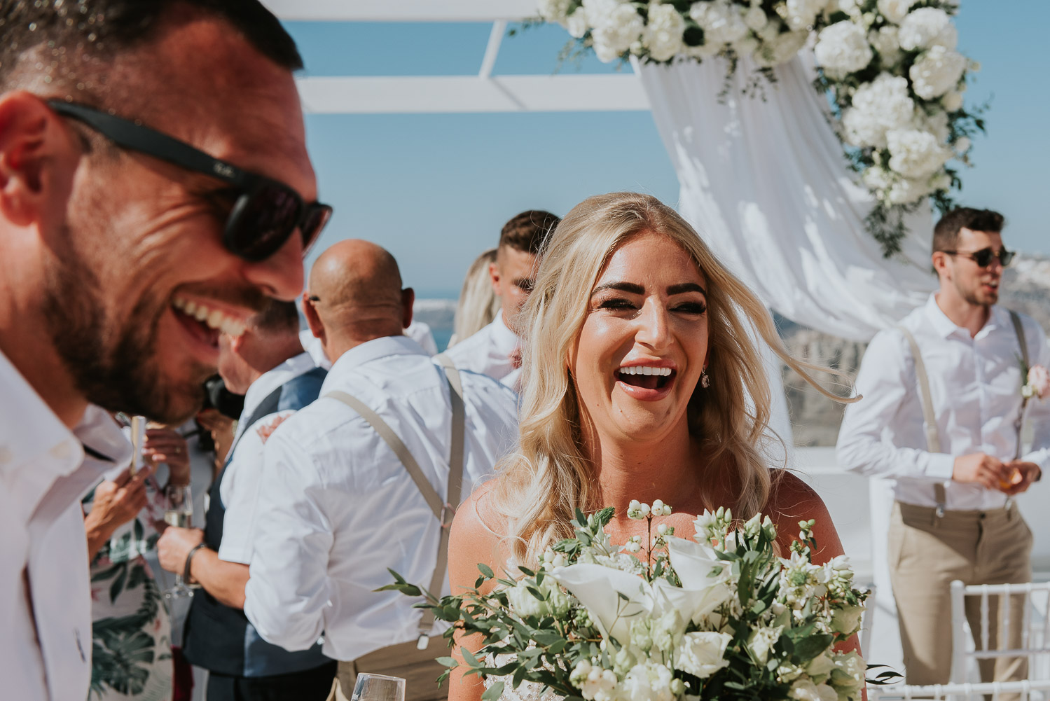 We had a very short time for the golden hour session at the sunset on the day. The entrance at the restaurant has a beautiful perspective overlooking the vineyards and the villages in the background on the caldera. Just love how Rachel and Jack were laughing and giggling throughout the day.